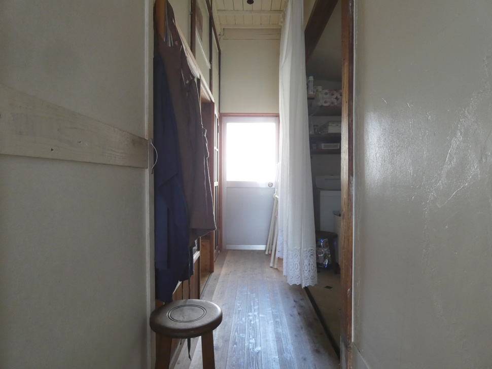 奥の廊下を通って、右手にキッチンと洗濯機置き場、左手に約6帖のスペース、突き当りにはトイレと裏口あり。