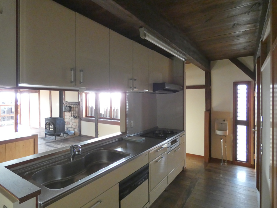 カウンターテーブル(水栓、シンク付)、薪ストーブ(残置物)、南面にはタイル床のサンルーム。