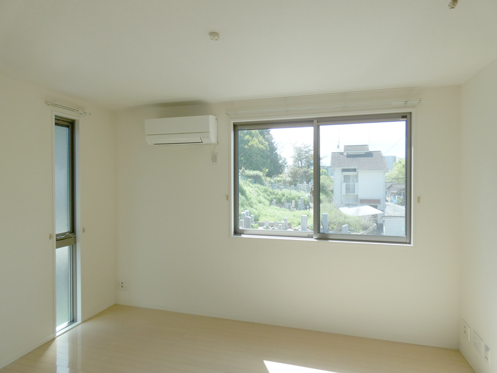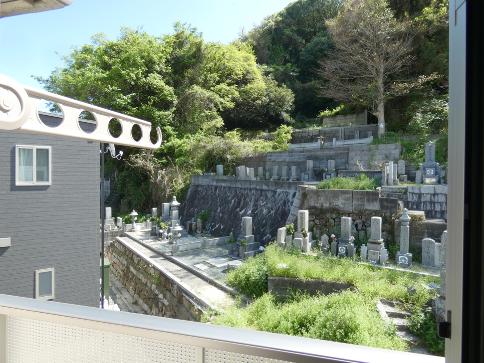 バルコニーは南向き、目の前にはお墓あり。(南、西方向)